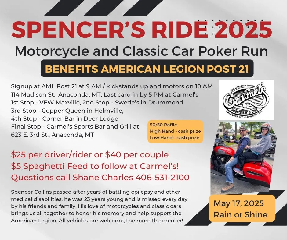 Events and More Wicked Que Food TruckCall for location and hours Jackpot Billiards TournamentEvery Sunday: 1 p.m.Call Shane at (406)563-7775 for details Spencer’s Ride 2025May 17th: Motors on at 10 a.m.